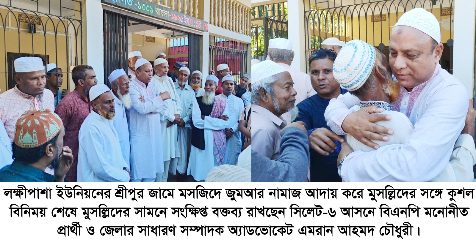 মুসল্লিদের সঙ্গে সৌজন্যসাক্ষাৎ শেষে লক্ষীপাশা ইউনিয়নের শ্রীপুরসহ ৬ নং ওয়ার্ডের বিভিন্ন উন্নয়নবঞ্চিত এলাকা পরিদর্শন করেন সিলেট-৬ আসনে ধানের শীষের কান্ডারি অ্যাডভোকেট এমরান আহমদ চৌধুরী। এসময় তিনি বলেন- আপনারা শুধু ভালোবাসা দিয়ে আমাকে সংসদে পাঠান, উন্নয়নের চিন্তা আপনাদের করতে হবে না। তিনি বলেন- মুমূর্ষু অবস্থায় থাকা গণতন্ত্রের মা দেশনেত্রী বেগম খালেদা জিয়ার দিকে তাকিয়ে দলের সবাইকে ঐক্যবদ্ধ থেকে সিলেট-৬ আসনে ধানের শীষের বিজয় নিশ্চিত করতে হবে।