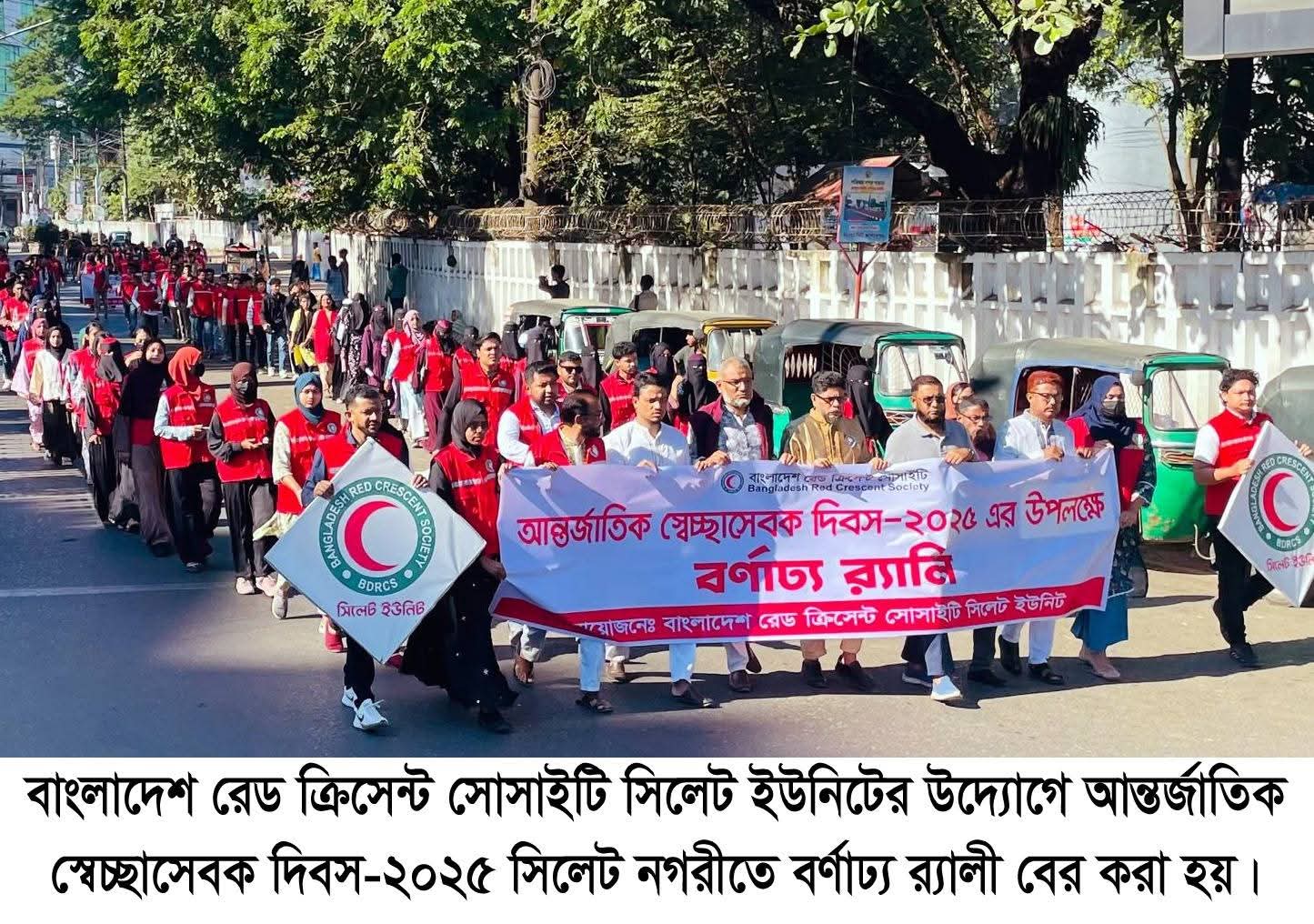 আন্তর্জাতিক স্বেচ্ছাসেবক দিবস–২০২৫ উপলক্ষে বাংলাদেশ রেড ক্রিসেন্ট সোসাইটি সিলেট ইউনিট বর্ণাঢ্য পরিবেশে দিবসটি পালন করেছে। এ বছরের প্রতিপাদ্য ছিল ‘আর্তমানবতায় সর্বত্র’। বৃহস্পতিবার সকাল ১০টায় সারদা হল প্রাঙ্গণ থেকে একটি র্যালি বের হয়, যা শহরের বিভিন্ন সড়ক প্রদক্ষিণ করে পুনরায় সারদা হলে ফিরে আসে। পরে সেখানে আলোচনা সভার আয়োজন করা হয়।