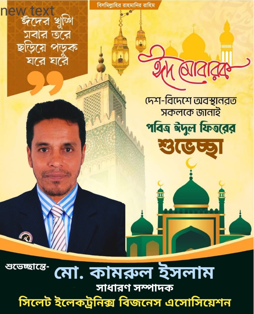পবিত্র ঈদুল ফিতর উপলক্ষে দেশ ও প্রবাসে অবস্থানরত সকল মুসলিম উম্মাহকে আন্তরিক শুভেচ্ছা ও ঈদ মোবারক জানিয়েছেন সিলেট ইলেকট্রনিক্স বিজনেস এসোসিয়েশন-এর সাধারণ সম্পাদক, বাংলাদেশ মানবাধিকার কমিশন সিলেট মহানগরের যুগ্ম সম্পাদক এবং নিরাপদ সড়ক চাই সিলেট জেলার সাধারণ সম্পাদক মো. কামরুল ইসলাম।